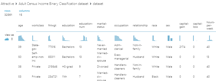 예를 들어 아래와 같은 경우는 셈플 처음에 나오는 Adult Census Income Binary Classification dataset 을 연결했더니