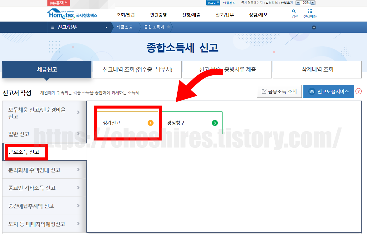 근로소득자 신고서란의 정기신고 작성 버튼을 클릭한면 됩니다.